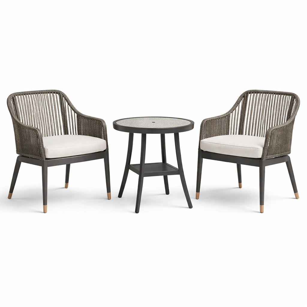 Este conjunto consta de dos sillas y una mesa redonda. Las sillas tienen estructura de acero y asientos de cuerda de ratán sintético con cojines de espuma revestidos de poliéster en color crema. La mesa presenta un tablero de vidrio templado de 5 mm de espesor. Las sillas miden 80 cm de alto, 60 cm de ancho y 62 cm de profundidad. La mesa tiene un diámetro de 70 cm. Peso de cada silla: 7 kg. Mesa: 10 kg. Resistente al agua y con protección contra rayos UV.